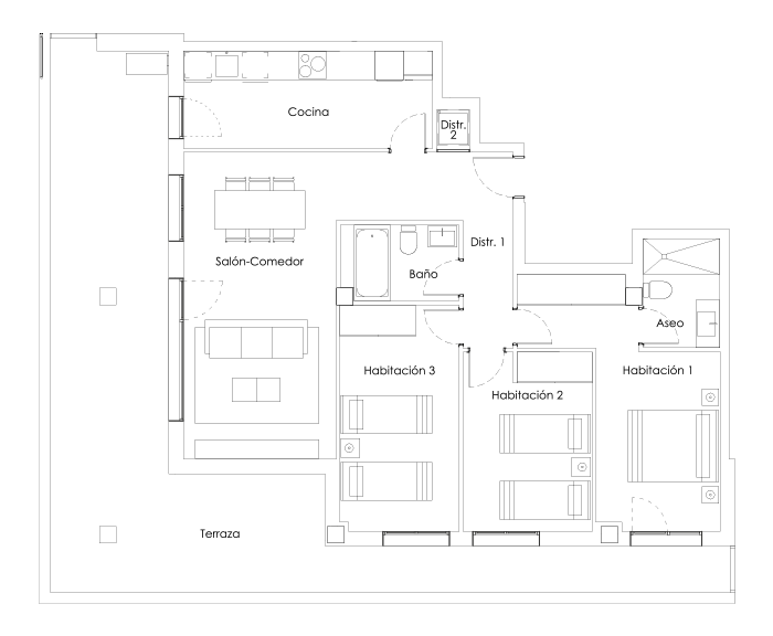 Los datos gráficos (planos, infografías, etc.) y de calidades, contenidos en el presente site, son orientativos y provisionales, y están sujetos a posibles modificaciones por razones técnicas o administrativas, asi mismo, el mobiliario y otros objetos, son meramente decorativos y no están incluidos en el equipamiento de las viviendas.